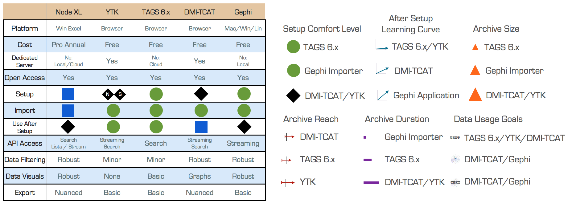 Figure 2 compares many of the features of the five archiving systems. On the left, the features of NodeXL, yourTwapperKeeper (YTK), TAGS, DMI-TCAT, and Gephi Streaming Importer are compared side-by-side. I borrow the ski slope difficulty scale, where a green circle means easy, a blue square means moderately difficult, a black diamond means difficult, and two black diamonds means very difficult. Under yourTwapperKeeper, I add NS to the black diamond because there is currently No Support. On the right, I present six mini-charts, with camparisons for Setup Comfort Level, After Setup Learning Curve, Archive Size, Archive Reach, Archive Duration, and Data Usago Goals. I again borrow the ski slope difficulty scale, but also include graphics that visually represent the result of particular archive systems. For example, once the archives are set up, the learning curve for the Gephi application is much steeper than for TAGS and yourTwapperKeeper. DMI-TCAT and yourTwapperKeeper offer a significantly larger archive size athan TAGS, but TAGS and yourTwapperKeeper will reach back farther than DMI-TCAT to collect tweets prior to the moment the archive is created. DMI-TCAT and yourTwapperKeeper will allow scholars to archive over longer periods of time. Each of these affordances and constraints should be considered prior to starting to archive tweets.