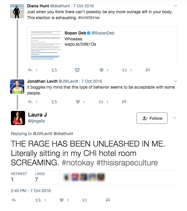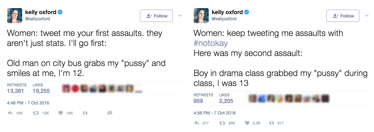 On October 7, 2016, the Washington Post released “Trump Recorded Having Extremely Lewd Conversation About Women in 2005” (Farenthold, 2016), which contained video and audio of then-presidential candidate Donald Trump claiming to have sexually assaulted women multiple times. On October 8, author Kelly Oxford released a tweet in which she called for women to share their sexual assault stories and shared her own. Several minutes later, she retweeted her call, this time adding the #notokay hashtag.