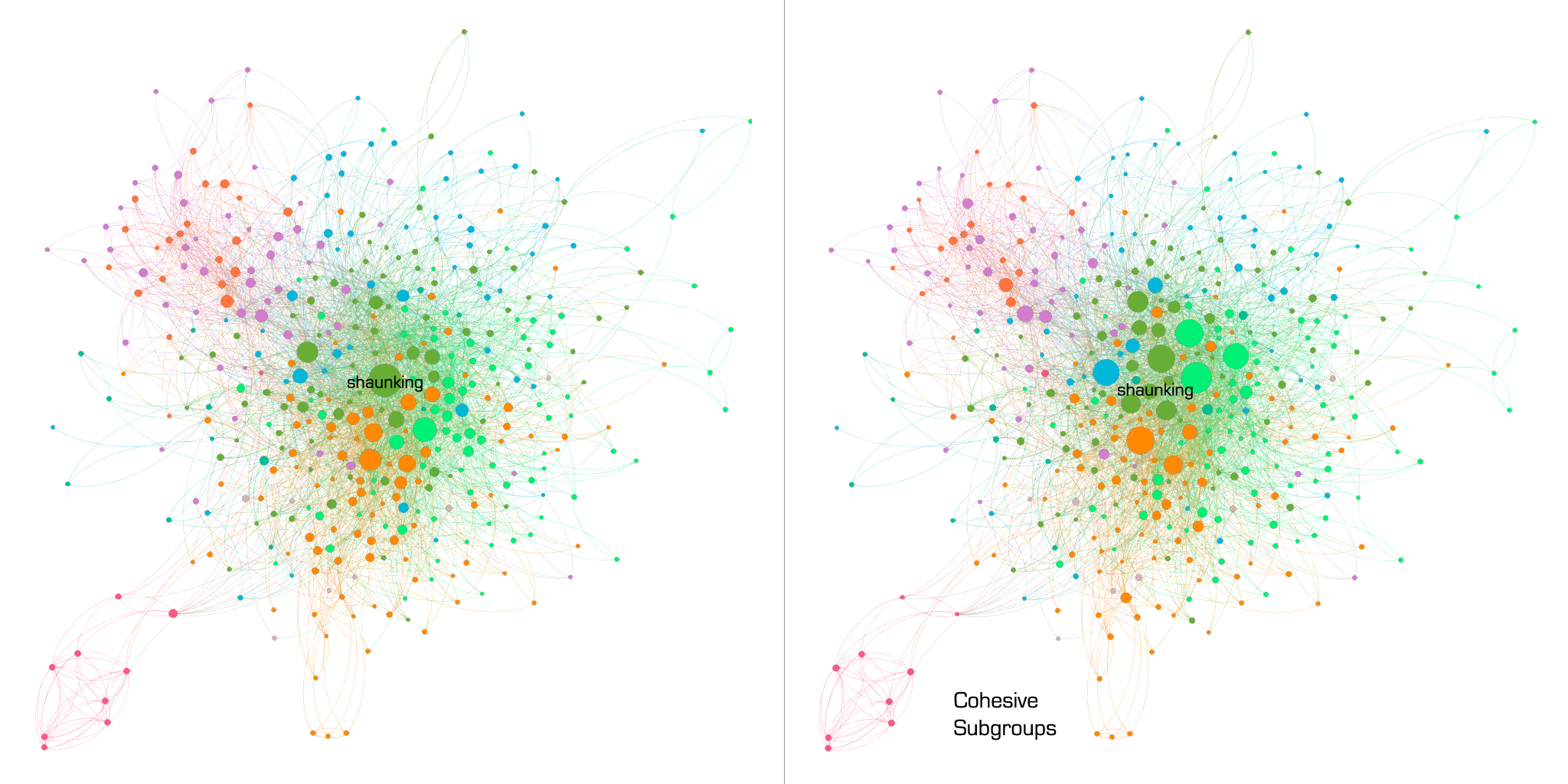 In Figure 6, for example, New York Daily News writer and racial justice activist Shaun King is mentioned in the tweets more than any other user (left map) even though he is not tweeting as often as other users (right map). The sizeable pink cohesive subgroup that appears at the bottom left of both maps is a group of students in the same fraternity at the University of Maryland having a conversation based on one or more tweets by Shomari Stone, a reporter for Washington, D.C.'s NBC affiliate channel, NBC4. I uncovered that information by going to each cohesive subgroup user's Twitter page and reading their bios. By investigating their tweets further, we have the potential to learn about how and, perhaps, why they are communicating about Terence Crutcher's death. Just one example shows how visualizations can reveal patterns in data that need to be explored in further depth.