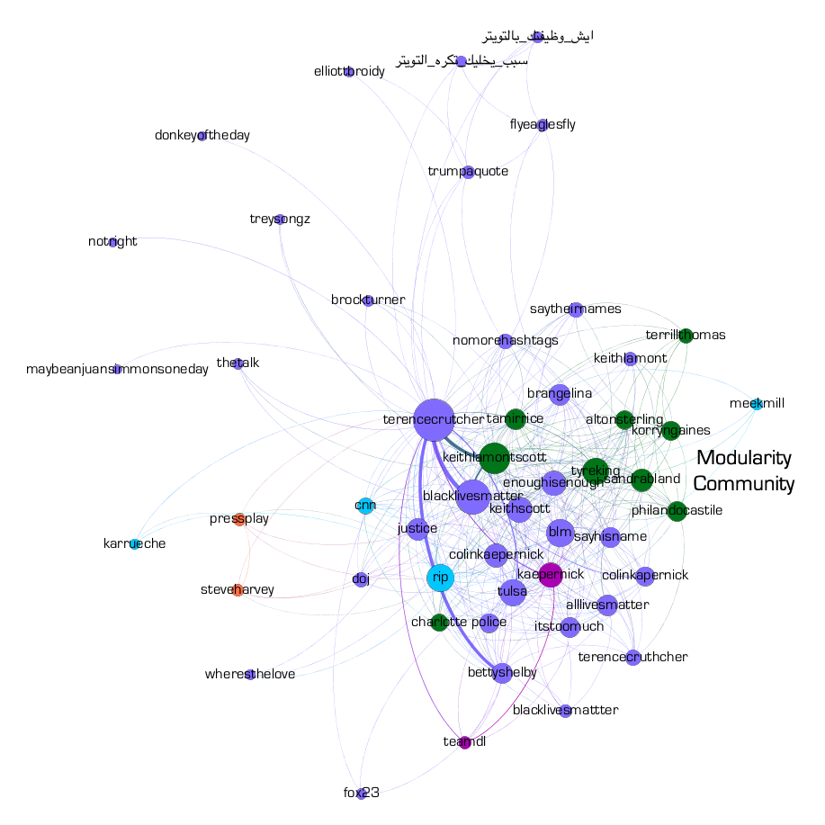 In Figure 7, the larger hashtags are all related to the deaths of Black men by police officers, as well as groups and individuals associated with efforts to bring those deaths to light and provide justice for the familes of the victims. The green modularity community on the right side of the map is significant because it is comprised of the names of Black men who were killed by police officers. Their grouping suggests that users are directly associating the death of Terence Crutcher with the deaths of the other Black men. We would need to investigate the tweets in further detail to see just how the users are associating the individuals and, perhaps, if they are employing any activists methods to help further their cause. There are also some unexpected hashtags, such as #donkeyoftheday, #treysongz, and #pressplay, that should be investigated to see how and why they are being used in the same tweets as #terencecrutcher.