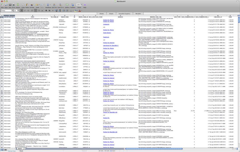 On June 5, 2009, programmer and technology consultant John O’Brien III announced he was dedicating his weekend to experimenting with the Twitter API. Two days later, O’Brien released TwapperKeeper, a free service that allowed users to archive tweets on a server hosted and maintained by O'Brien. TwapperKeeper was an immediate sensation, with thousands of individuals using it to store millions of tweets. In August 2010, O’Brien released yourTwapperKeeper, which allows users to run the software on their own dedicated server; later, professor and social media researcher, Axel Bruns, released new and revised PHP scripts that extended yourTwapperKeeper features and fixed bugs, including one that replaced the last three digits of tweet ID numbers with three zeros (Bruns, 2011). On September 16, 2011, Hootsuite announced it was buying TwapperKeeper for 3 million dollars. On May 2, 2013, O’Brien released version 2 of yourTwapperKeeper that reflected changes to the Twitter API (O’Brien, 2013). TwapperKeeeper was revolutionary when first released and very easy to use; yourTwapperKeeper was similarly important because it gave individuals the opportunity to archive millions of tweets on their own server. The installation, however, is extraordinarily complex for people with limited programming skills and comfort levels, and, other than a rarely used Google message board, offers little-to-no support when problems arise. As of this writing, yourTwapperKeeper only exports to Excel, HTML tables, and JSON, though the Digital Methods Initiative FAQ page provides instructions for how to import yourTwapperKeeper databses into DMI-TCAT. When exported as a spreadsheet, the data look like this: