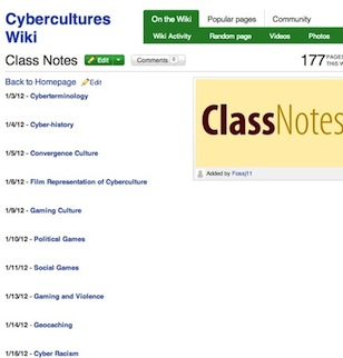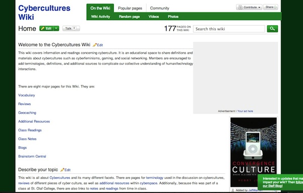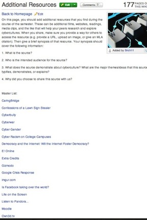 Both courses (Cybercultures and Gender and Literature) began with four or five major pages that I created for the class. I built a home page that encouraged strong wiki organization by creating a bulleted list of major pages on the homepage. As you can see below, the final result was that the home pages changed drastically over the course of the term. Also note that the formatting of the wiki home page was imperfect, which is a byproduct of encouraging students to play with the technology instead of giving step-by-step directions on what was expected.
