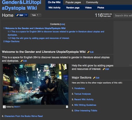 Note that Image 1, the home page for Cybercultures, reports 177 pages on the wiki, while Image 2, the home page for Gender and Literature, reports 116 pages. The Cybercultures wiki was much more extensive and maintained by only 20 students, while the Gender and Literature wiki was maintained by 40—double the number of students.
