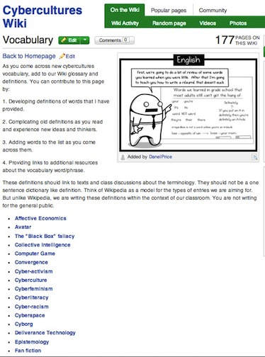 Below are screenshots from the Cybercultures class and how they managed the vocabulary section of the wiki. Image 3 is the vocabulary main page, which the students constructed themselves. Image 4 is a sample vocabulary entry.