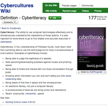 Image 4: Screenshot of Cybercultures Wiki Cyberliteracy Vocabulary Entry (Transcript of Image 4)