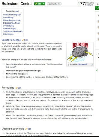Students in the Cybercultures class were frustrated by the open-access editing process of the wiki. They, therefore, came up with this solution: Brainstorm Central. Students used Brainstorm Central to debate formatting, content, and structural components of the wiki. This page also allowed them to keep track of items that had been completed.