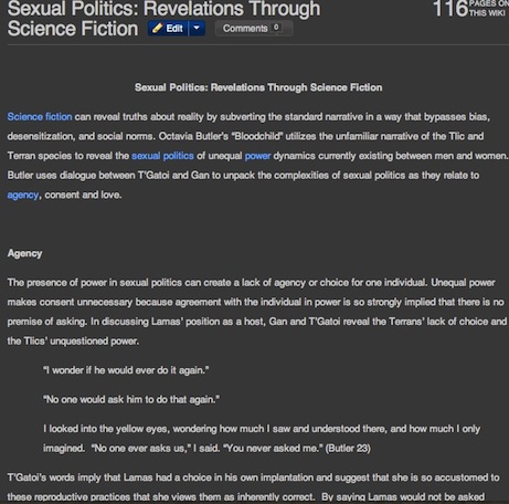 While the Gender and Literature class did not engage in the same level of play with the wiki, they did ensure that there were strong links between the pages that they created. For example, they relied heavily on their wiki vocabulary entries to define their terms for their literary analyses: