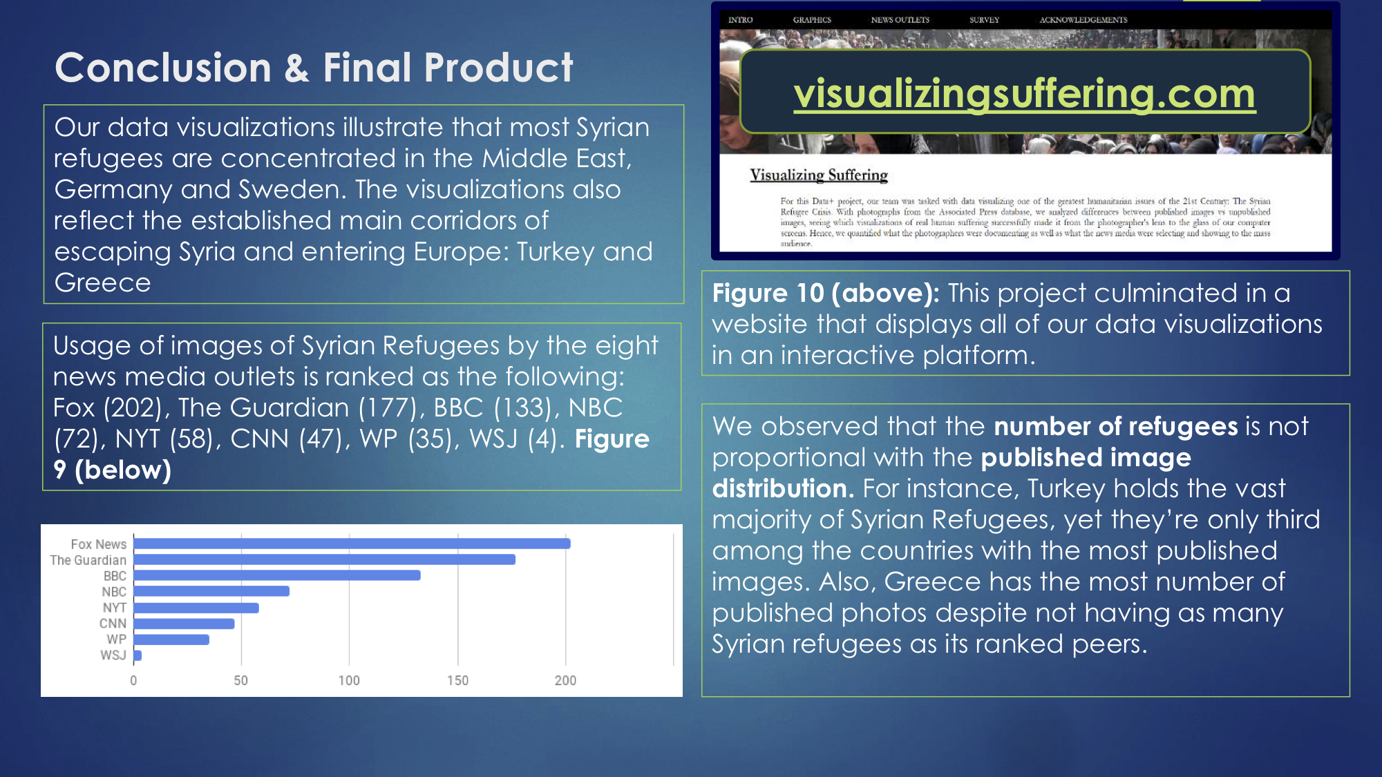 Figure 4: A slide from their executive summary in which students detail what is found in their data visualizations, list the number of AP images used by their studied news outlets, and include their final observation that the number of refugees is not proportional to the published image distribution. The image explains that the project culminated in a temporary website entitled visualizingsuffering.com.