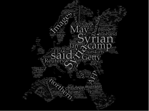 Second, in order to better understand the link between images and descriptions in media, the group created word clouds for each news outlet selected in the Pew Research Center’s study. The word clouds allowed them to notice patterns of linguistic frequency around descriptive language, patterns related to the political leanings of the outlets. In particular, our students were interested in different emphases on words that had legal ramifications for the immigration systems—such as “refugee” vs. “migrant” (UNHCR 2017). They noted that news outlets that were identified as left leaning by the Pew Research Study were more likely to describe Syrian persons as refugees rather than migrants—thus marking Syrian refugees as having important legal rights and protections. As illustrated in the image below, the group turned the word clouds into “word Europes” so as to clearly show to their peers in the program how each news agency’s language shaped the representation of the Crisis to their audiences.