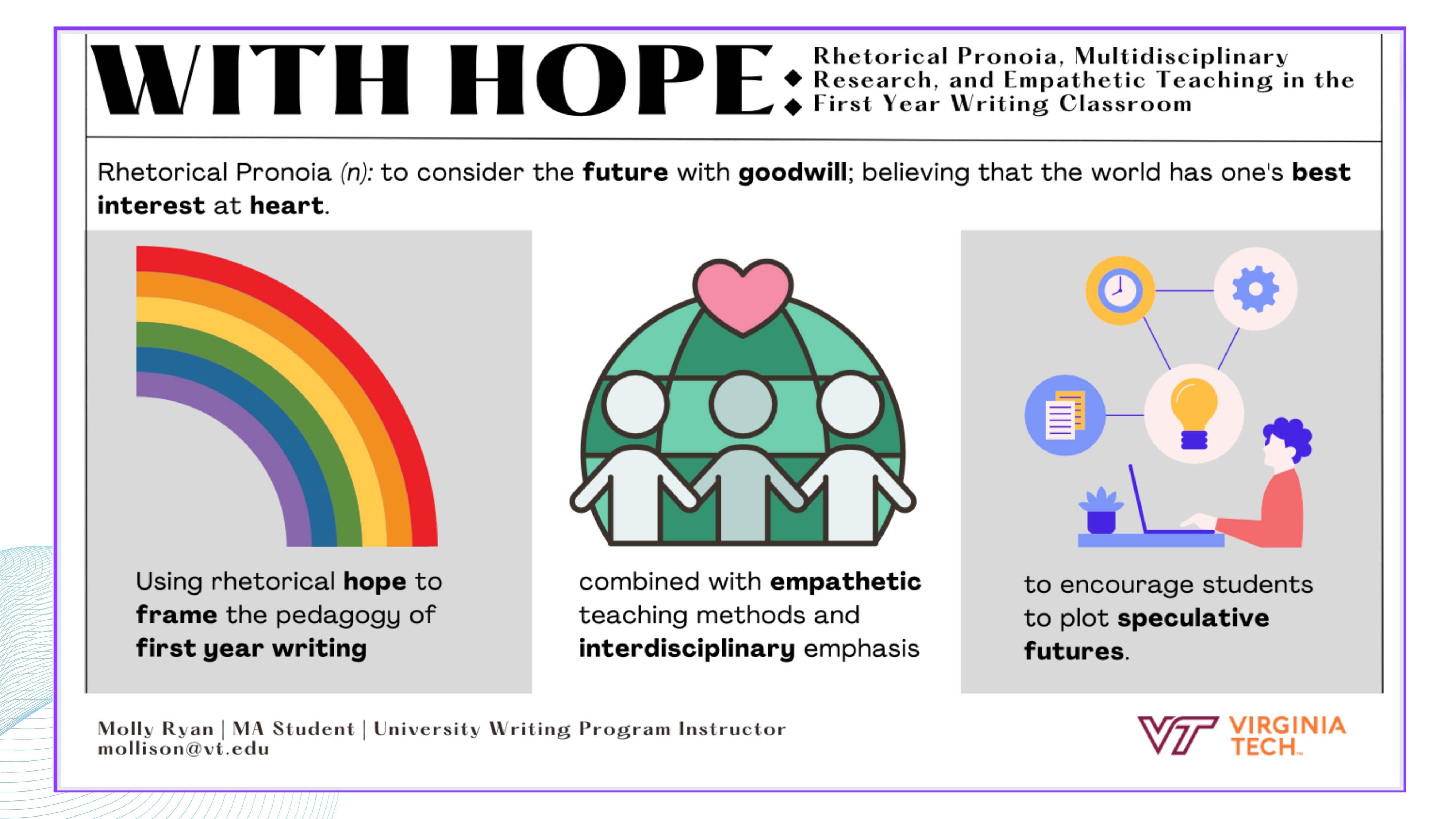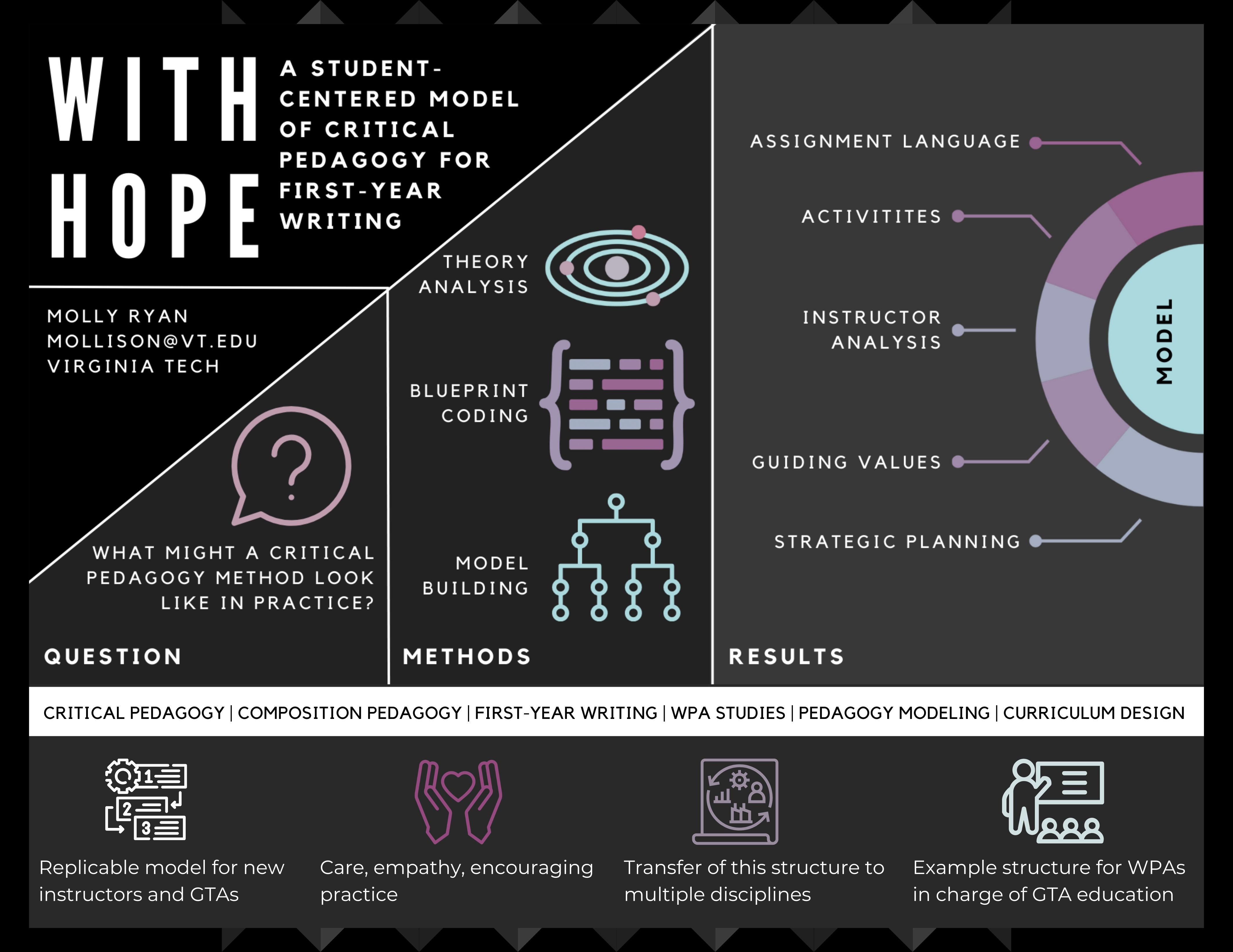 - Rhetorical choices: What rhetorical strategies does your visual employ, and in what way? I am less concerned with perfect answers here and more concerned with thoughtful use of terminology. For example, if your visual abstract establishes logos, is logos established through the order of the information, the choice of font or headings, and so on? How does this visual abstract honor your identity or personality as a researcher?